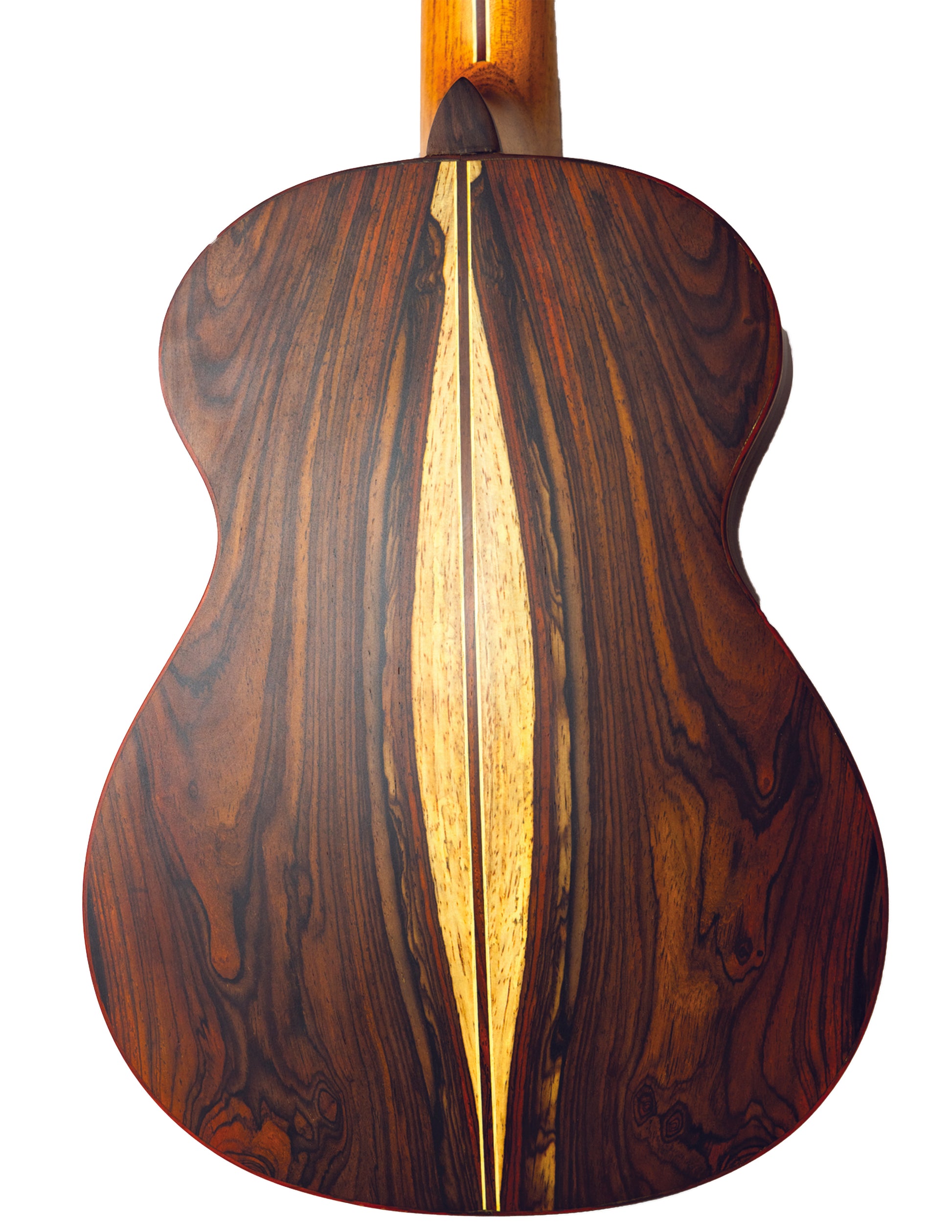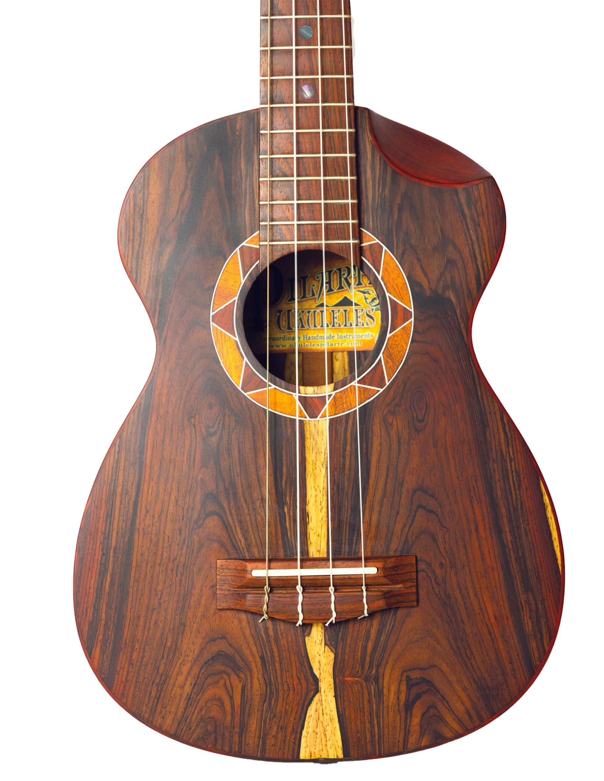This tenor-sized baritone ukulele packs a punch. It's tenor length scale makes it easy to switch between your tenor and baritone sound. You can also string this instrument up with tenor strings as a GCEA. It has a warm full-bodied, resonant sound. The front body is solid nicaraguan cocobolo tonewood and the back is bookmatched for a symetrical look. The White sapwood features some spalting. This ukulele has a small cutaway to maximize resonance and comfort as well as a sunburt rosette. All Pilarte ukuleles are made with a radius fretboard (slight curvature of the fretboard) that aligns with the natural curve of your finger, making pesky barr chords a dream.
